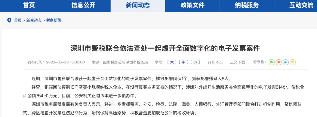 深圳市犯罪团伙控制15户空壳小规模纳税人企业,在没有真实业务交易的情况下,涉嫌对外虚开生活服务类全面数字化的电子发票814份,价税合计金额754.61万元。