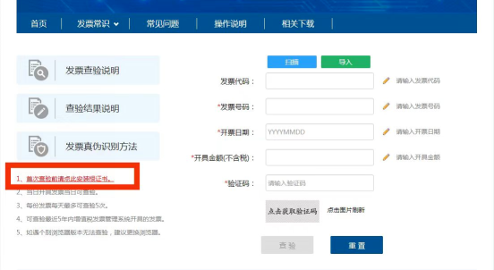 若首次使用此网站查验,请先安装根证书。安装完毕后,需重新进入平台。