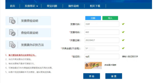 查验方法与纸质发票相同,均需在右侧查验区域填写完整的发票代码、发票号码、开票日期、开具金额(不含税)信息。