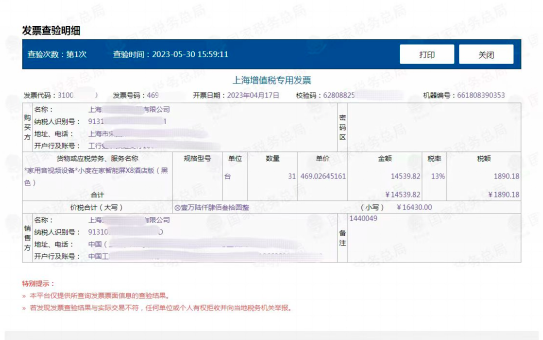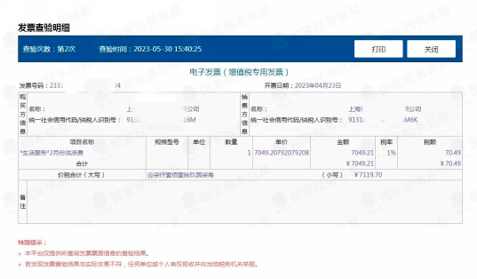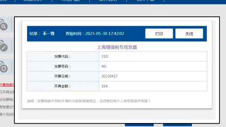 【打印查验结果】会显示发票的基本信息及查验次数、查验时间、查验结果。
