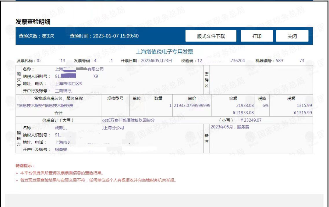 同样是在国家税务总局全国增值税发票查验平台进行查验,在该平台查验方法与查验纸质发票相同。查验后显示票面信息为: